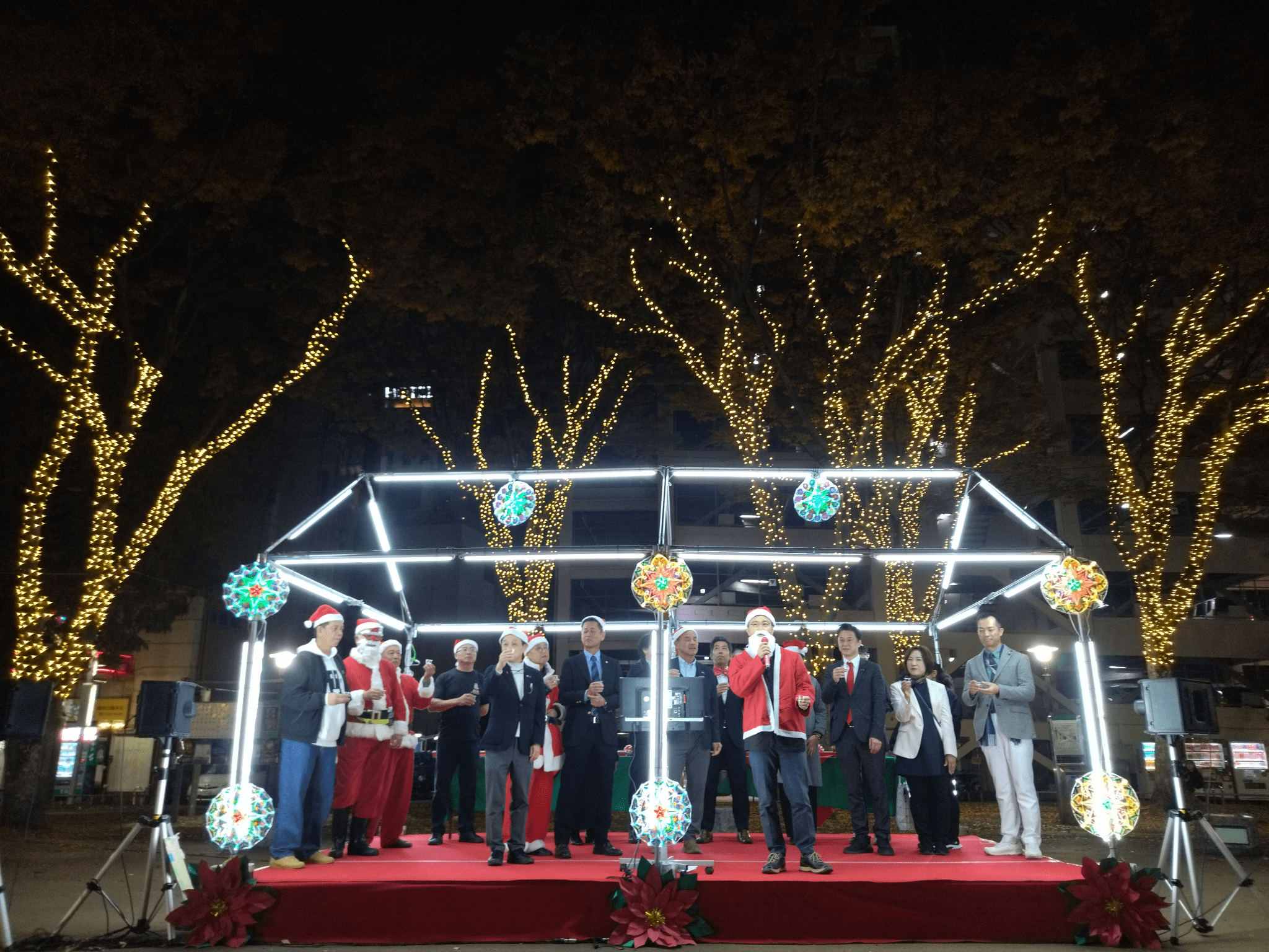1日目(14日)は、イルミネーション点灯式と、点灯を祝うワインパーティーや各種ステージ企画を実施しました。在名古屋フィリピン総領事館による出展や、子ども向けのサンタクロースプレゼントタイムを新たに企画し、池田公園を彩る柔らかな光に会場全体が包まれました。